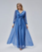Kadın Mavi Simli Tüllü Kruvaze Yaka Uzun Kollu Kuşaklı Abiye Elbise HV063051