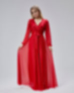 Kadın Kırmızı Simli Tüllü Kruvaze Yaka Uzun Kollu Kuşaklı Abiye Elbise HV063051