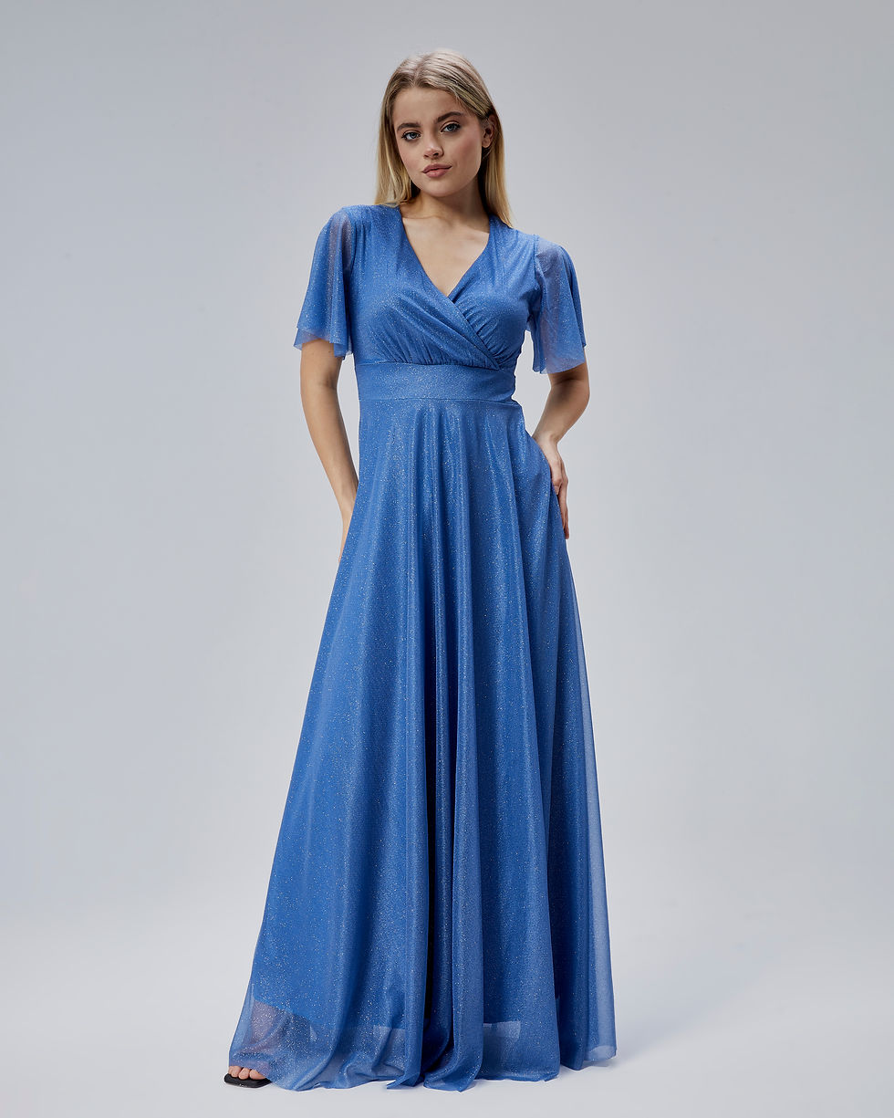 Kadın Mavi Simli Uzun Abiye Elbise Kruvaze Yaka Şık Model HV06063051